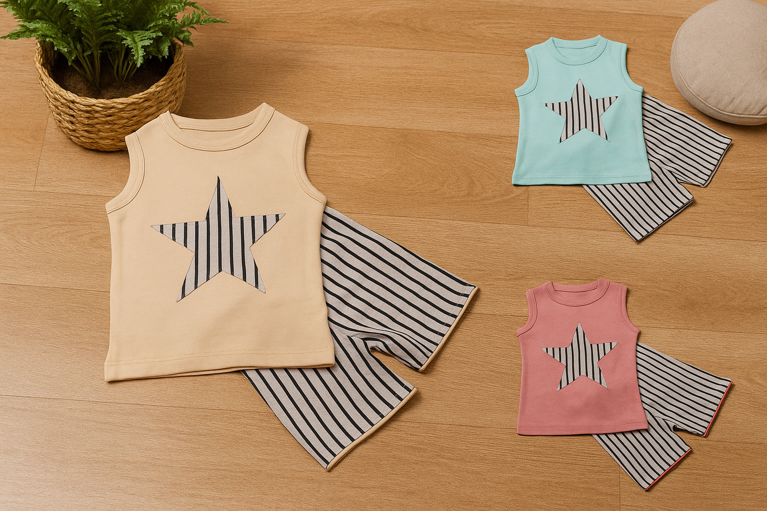 This adorable set pairs a sleeveless tank with a bold star motif in cozy cotton with stylish, contrasting striped shorts. A perfect combo of trendy and comfy—ideal for playdates and summer adventures.