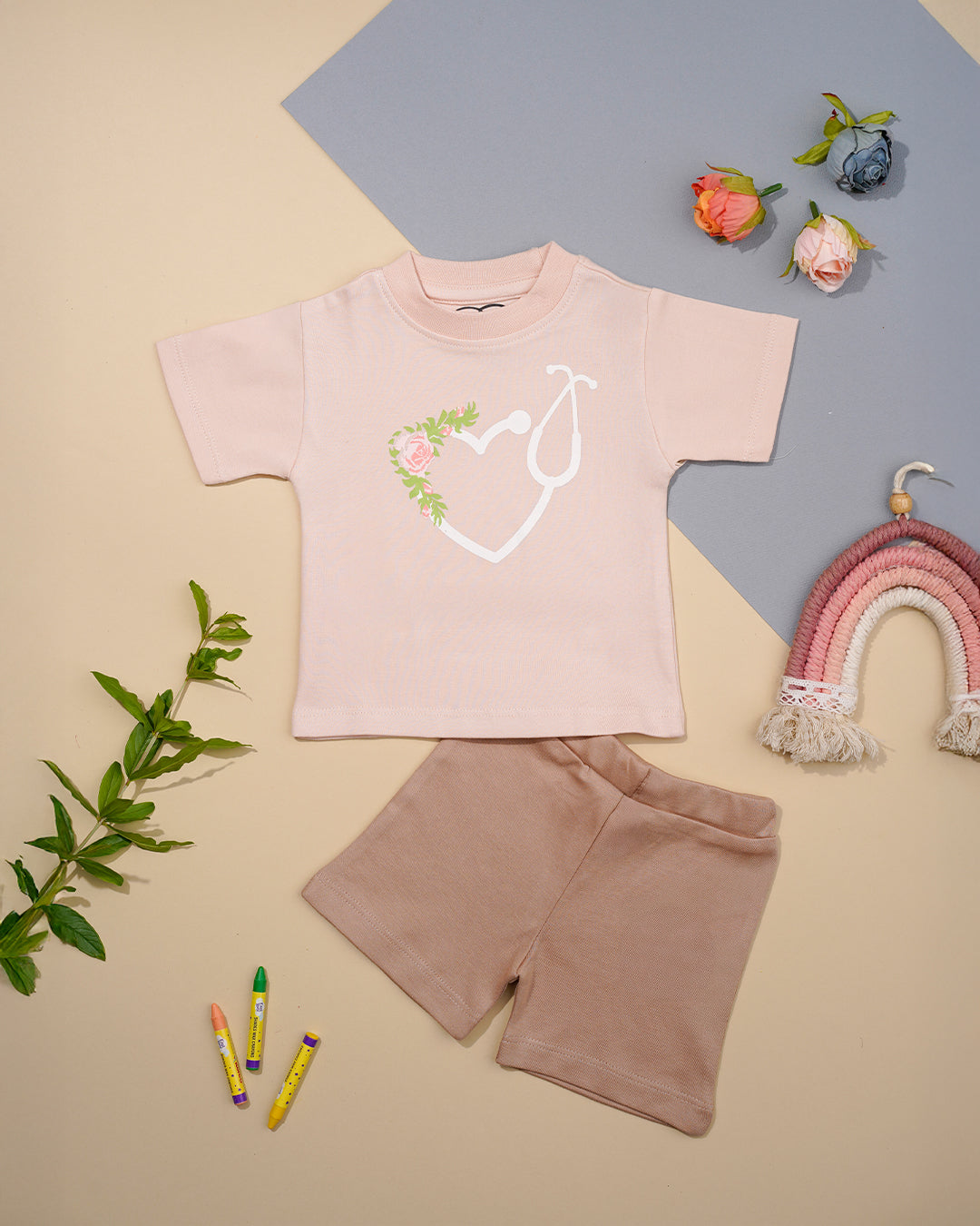 A charming two‑piece set featuring a soft pastel T‑shirt with adorable heart‑shaped stethoscope print, paired with comfy brown shorts. Perfect for casual playdates, this outfit brings together sweet design and everyday comfort effortlessly.