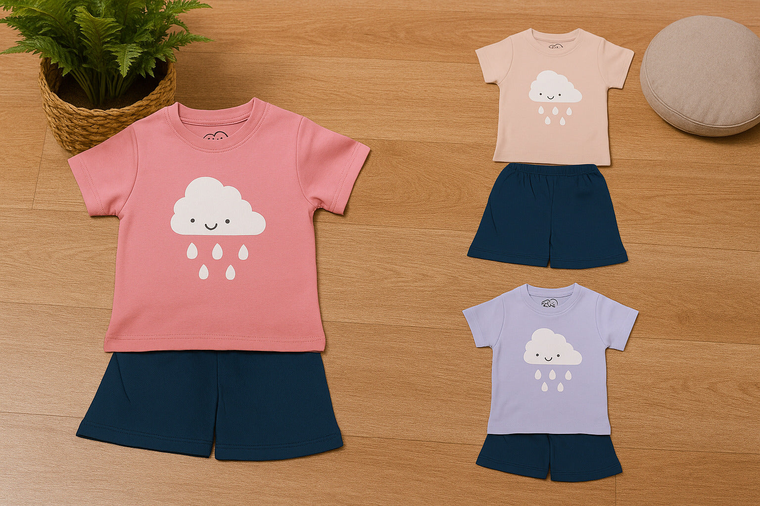 Cute cloud print tees effortlessly with navy blue shorts for a cheerful, weather-inspired ensemble that’s simple yet stylish.